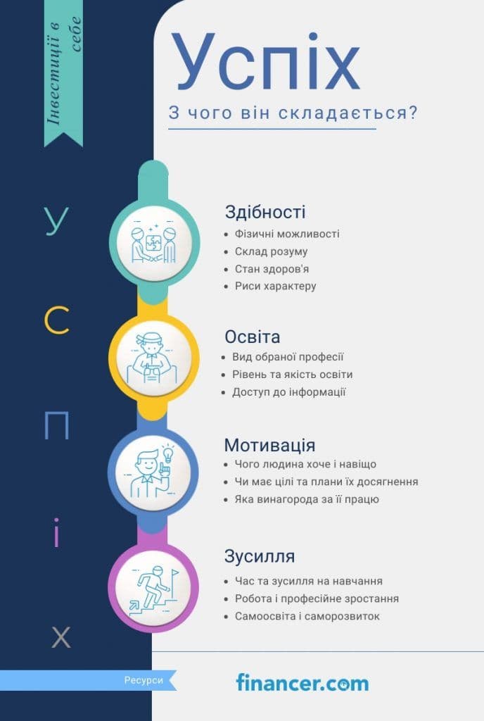 Успіх є результатом поєднання здібностей, багажу знань, наполегливої праці та фінансових інвестицій. Це не завжди помітно для інших, але успішні люди вкладають багато часу та грошей у власний саморозвиток.