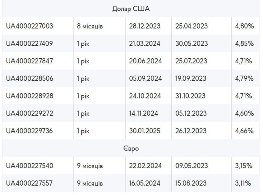 Найменшу прибутковість мають військові облігації в доларах та євро – 4,80% і 3, 15% відповідно. Але вони більш захищені від коливань української гривні.