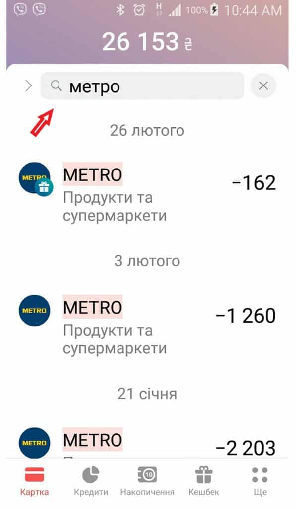Для прикладу, якщо написати назву магазину, то можна побачити всі зроблені у ньому покупки, я якщо ім'я контакту – всі грошові перекази на його карту.