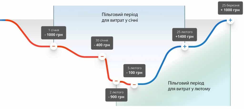 Наприклад, якщо у січні витратити 2400 грн з кредитної картки Приватбанку, і до 25 лютого поповнити її лише на 1400 грн, то на розрахункову дату 25 лютого картка буде в мінусі на 1000 грн, але банк нарахує відсотки на найбільшу суму 2400 грн.