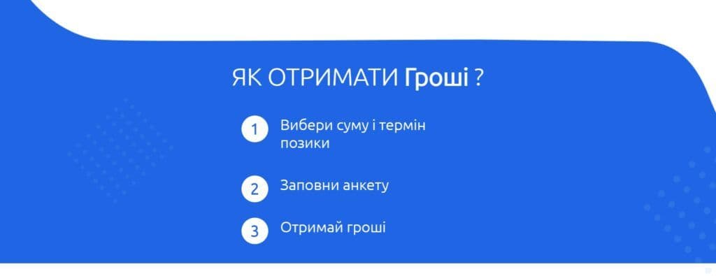 Умови кредитування гнучкі — суми від 500 до 20000 грн, терміни та ставки залежать від вибраного партнера. Кредитна історія зазвичай не враховується, що відкриває доступ до грошей більшості клієнтів.