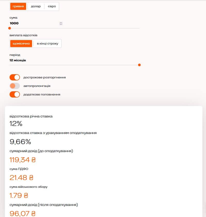 Мінімальна сума вкладу становить 100 ₴ / 10 $ / 10 €, а максимальний вклад обмежений сумою 2 000 000 ₴ або 100 000 $/€. Це робить депозит доступним для різних категорій клієнтів.