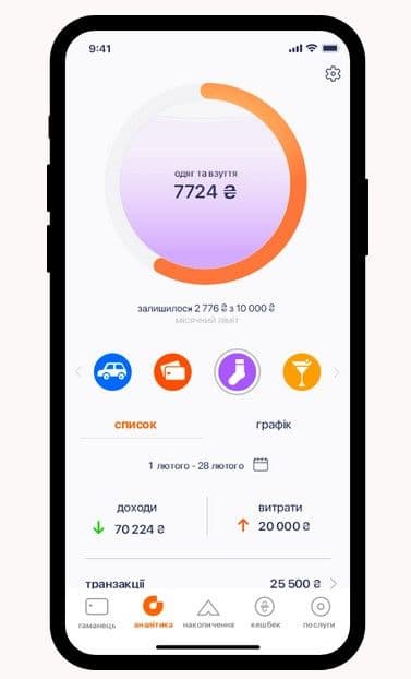 Отримувати аналітику витрат в 25 категоріях. Сервіс пропонує детальний аналіз витратного споживання користувача, розподілений за різними категоріями, що допомагає краще розуміти фінансові звички та дозволяє зробити вірний вибір щодо ефективного управління фінансами.