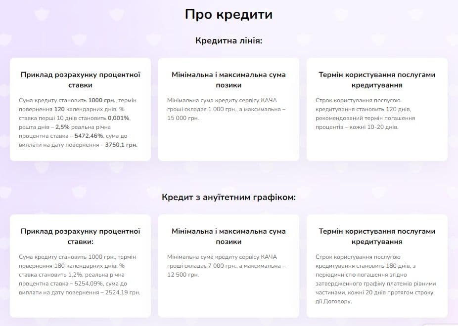 «Кредитна лінія». Кошти надаються на термін 120 днів, але рекомендований термін погашення процентів – що 10-20 днів. Процентна ставка складає від 0,001% до 2,5% на добу. Максимальна сума кредиту – 15 тисяч гривень. Комісія становить від 0% до 10% від розміру наданої позики.