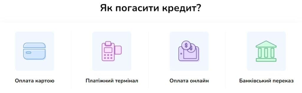 Організація пропонує різні способи погашення кредиту, що дає клієнтам можливість обрати найбільш зручний варіант: