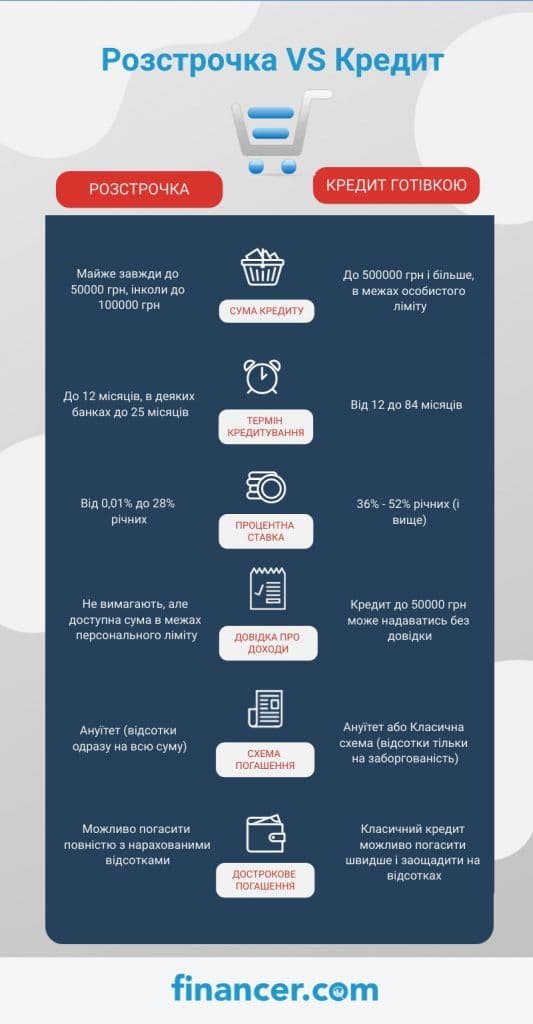 В обох випадках позичити можна тільки таку суму, яка обмежена індивідуальним кредитним лімітом. Доступна сума для готівкового кредиту зазвичай перевищує ліміт для споживчої розстрочки.