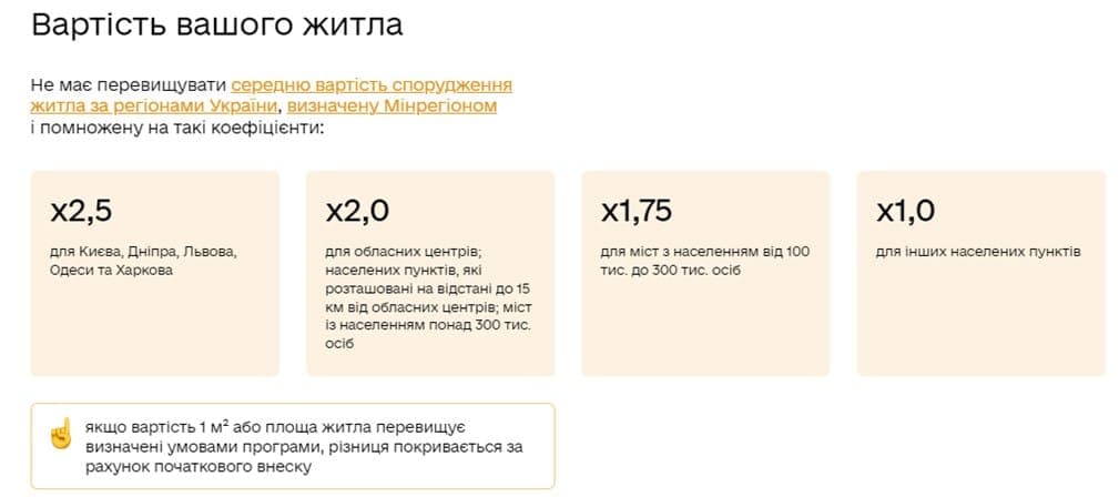 Якщо вартість 1 м² або площа бажаної квартири перевищують умови програми, позичальник все одно може скористатись нею, але різницю потрібно буде додати до початкового внеску.