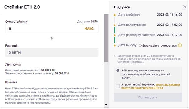 Натисніть на «Стейкінг» біля токену ETH. Криптовалюта буде зафіксована, після заповнення необхідних полів.