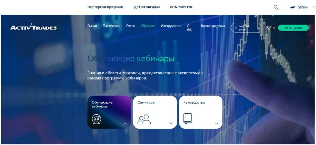 ActivTrades пропонує досить багато навчальних матеріалів російською мовою. Інформації на англомовній версії сайту значно більше. Там пропонуються 1-на-1 уроки для бажаючих, а також щотижневі вебінари з різними лекторами.
