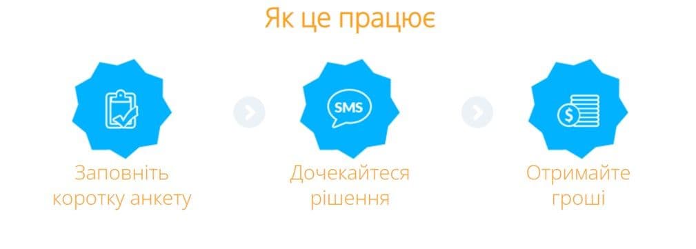 Термін кредитування – від 7 до 30 днів. Вік позичальника: 18-65 років. Швидке зарахування коштів на картку. Можливість пролонгації та реструктуризації заборгованості. Для оформлення необхідні паспорт, ІПН та українська банківська картка.