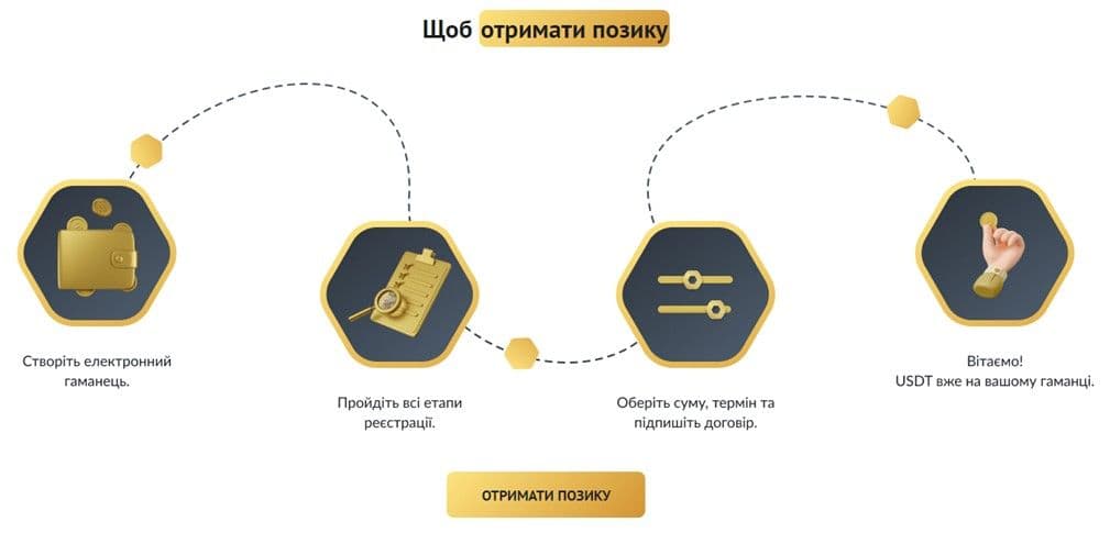 Клієнт може вибрати суму від 100 до 500 USDT і строк від 5 до 30 днів. Відсутність застав, довідок про доходи та перевірки кредитної історії робить сервіс максимально гнучким. Оформлення — повністю онлайн, без прив'язки до місця проживання.