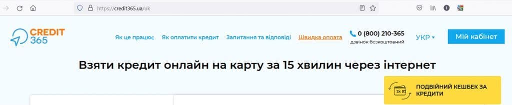 Сredit365 (Кредит 365) – один з найперших сервісів онлайн кредитування, який був створений у 2013 році. Він працює на веб-платформі і надає швидкі позики на банківську картку.