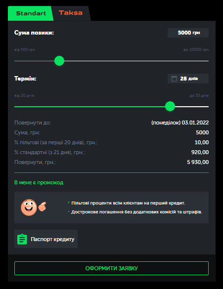 За умови оформлення кредиту Standart клієнту надається позика на максимальну суму 20 000 грн, максимальний срок кредитування 30 днів.