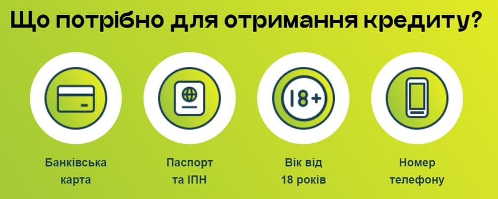 Мати банківську карту. Компанія пропонує лише онлайн позики, тому поступить кредит на карту, яка зареєстрована на ім’я отримувача.