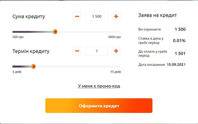 | Перший кредит | до 3000 грн | 0,01% - 2% на день |