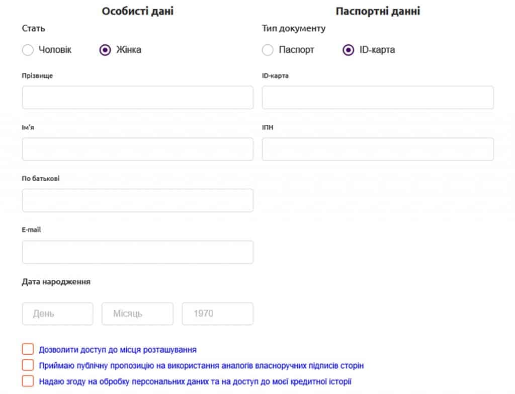 Заявка на кредит включає анкету, в якій потрібно вказати персональні дані згідно з паспортом, та два додаткові контактні номери телефонів.