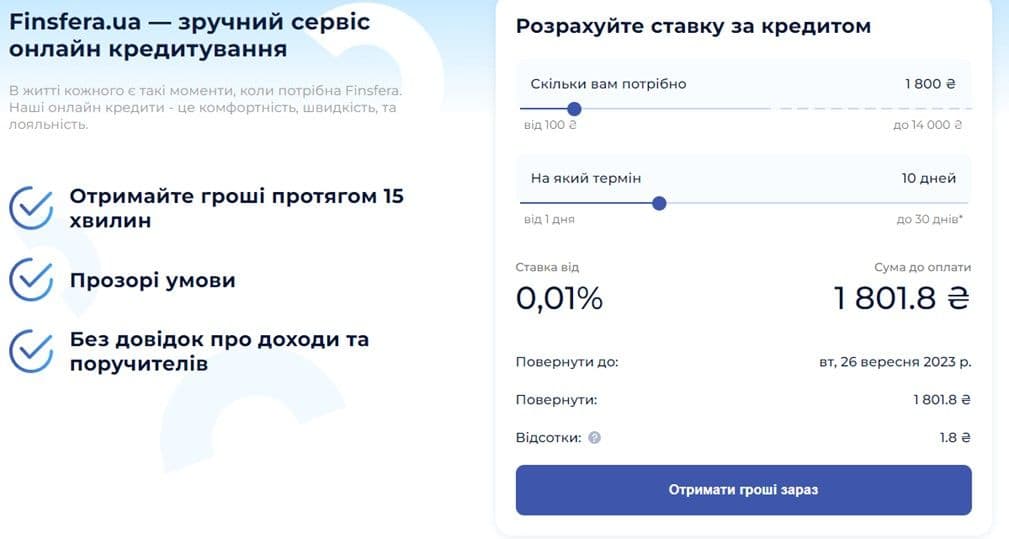 Finsfera пропонує перший кредит за мінімальною ставкою 0,01%. Для постійних клієнтів діють знижені ставки. Доступні суми кредитування від 500 до 18 000 грн із можливістю пролонгації та використання промокодів для отримання вигідніших умов.