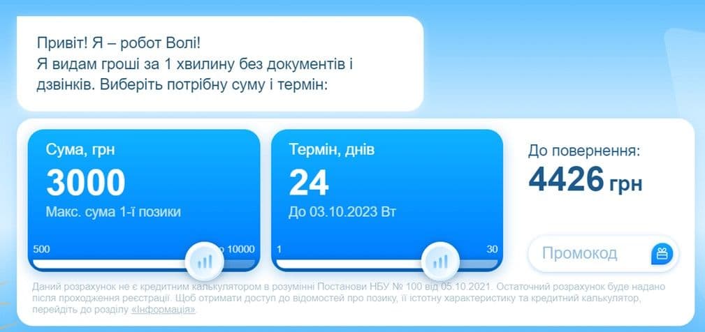 Це відбувається у форматі діалогу з Волі – чат-ботом сервісу. Під час цього етапу потрібно також вказати номер телефону та особисті дані. Заявку з особистими даними потрібно заповнювати лише при оформленні першого кредиту.
