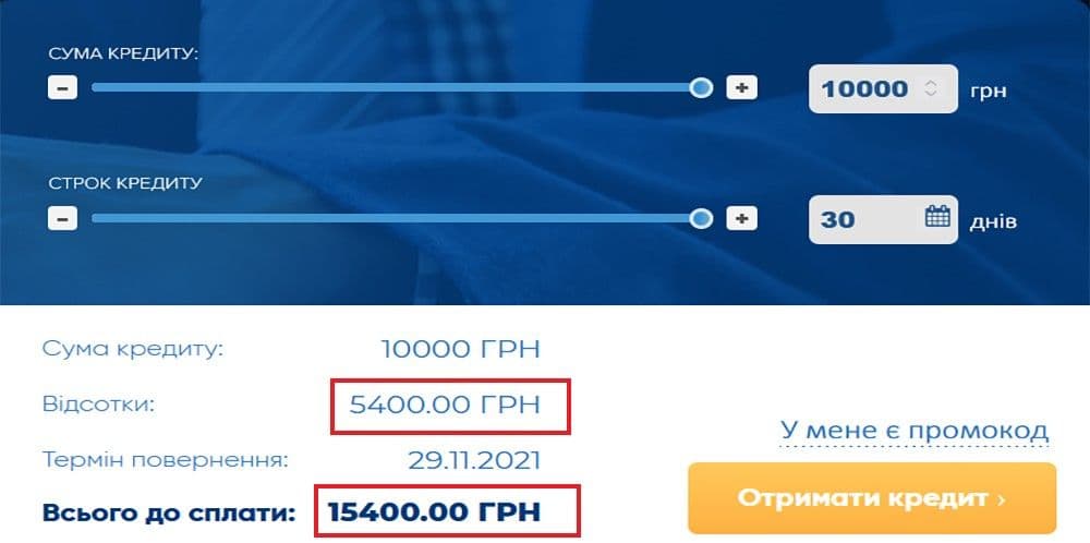 Орієнтовну вартість кредитів можна дізнатись за допомогою кредитного калькулятора на сайті microcredit.ua. Зменшити ставку допоможе промокод microcredit, який надсилають постійним клієнтам в sms, або на email.