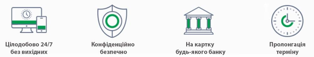 Кошти можна отримати на короткий термін від 1 до 30 днів або від 3 до 12 місяців. Позика на карту надається без довідок про доходи, без застави чи поручительства третіх осіб.