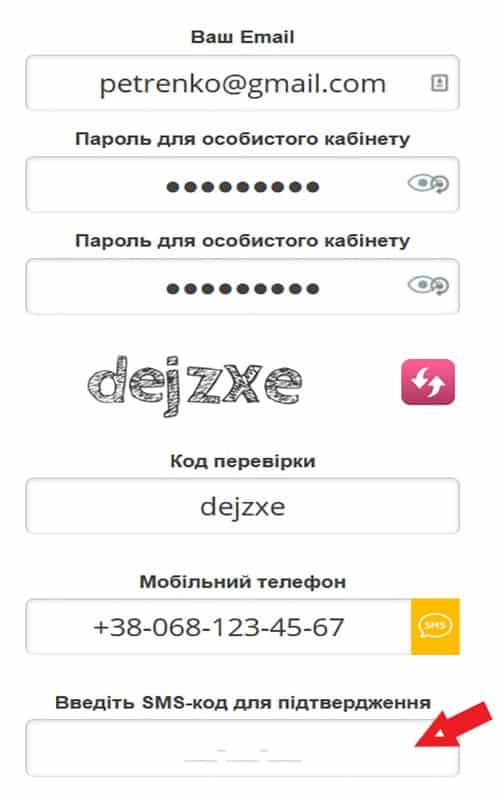 👉 Далі відкривається сторінка для реєстрації, на якій потрібно вказати номер телефону та електронну адресу, підтвердити згоду з правилами сервісу і ввести код, який буде надісланий в SMS.