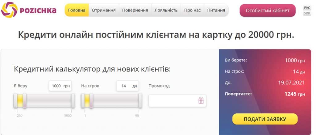 👉 Перейдіть на офіційний веб-сайт pozichka.ua/ua, оберіть за допомогою слайдерів потрібну суму та термін кредиту, і натисніть «Подати заявку». Якщо у вас є промокод – введіть його у відповідне поле для отримання знижки.