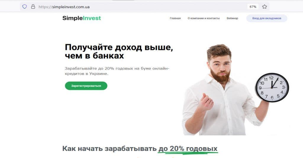Simple Invest – це платформа P2P кредитування, яка дає можливість інвестувати гроші в боргові зобов'язання за споживчими кредитами. Компанія є посередником між приватними інвесторами, які бажають та фінансовою компаніяєю, яка видає короткострокові кредити позичальникам.