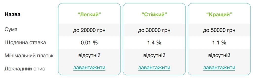 Вебсайт і система автоматизованого кредитування працює тільки перший рік. На даний час доступні три кредитних продукти: кредити "Легкий", "Стійкий" і "Кращий".
