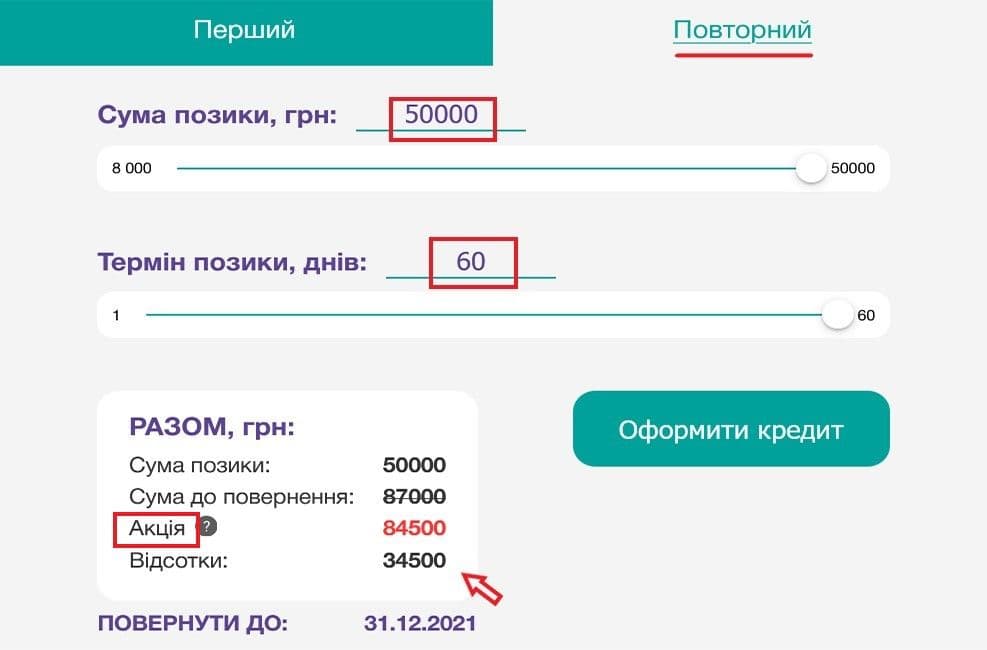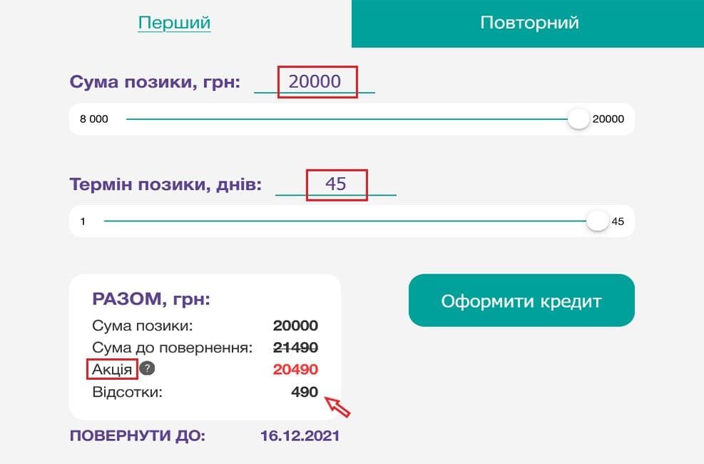 При повторному зверненні доступна сума кредиту зростає. Калькулятор показує, яка буде орієнтовна вартість повторного кредиту, якщо обрати максимальну сума і термін: