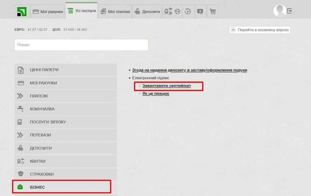 Перейти до Приват24 > Всі послуги > Бізнес > Завантажити сертифікат.