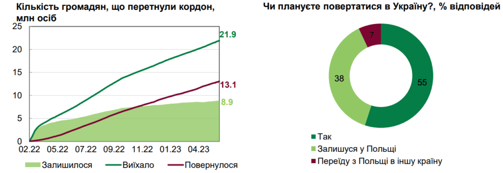 Тобто, орієнтовний відтік населення України становить близько 10 мільйонів людей. Більш того, після закінчення війни та відкриття кордонів виїхати з держави хоче ще кілька сотень тисяч українців.