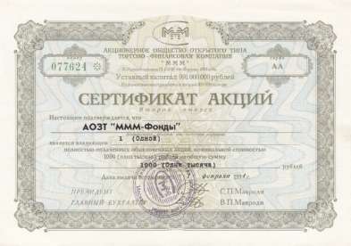 МММ – найперша та найвідоміша класична фінансова піраміда, яка була створена в Росії Сергієм Мавроді. В піраміду були залучені приблизно 15 млн осіб. Компанія починала свою діяльність у 1989 році з торгівлі оргтехнікою. У 1993 році відбулась перша емісія акцій номіналом 1000 грн.