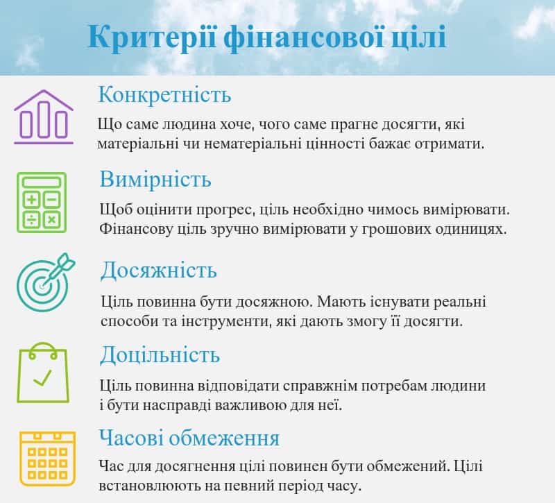 Фінансові цілі завжди пов’язані з задоволенням певних потреб людини. Приклади фінансових смарт цілей: