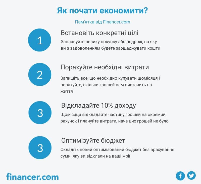Щоб почати економити гроші складіть свій бюджет на місяць і встановіть ліміти. Визначіть граничні витрати на день, та на тиждень, і слідкуйте за їх дотриманням. Гроші, які залишились в кінці місяця, ви можете витратити на щось приємне, наприклад, на покупки чи розваги.