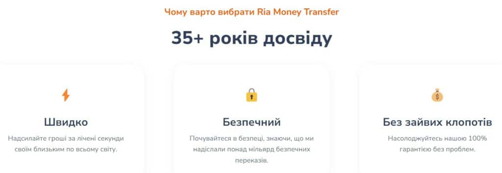 Система міжнародних грошових переказів RIA надає можливість передавати кошти завдяки 435 тисячам пунктів обслуговування, розташованих у 160 країнах світу. Кошти можна пересилати у доларах США та євро.