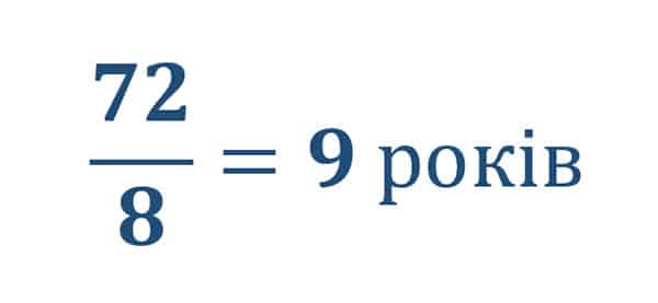 Наприклад, ви хочете вкласти 1000 гривень під 8% річних. Розрахуємо, коли інвестовані кошти подвояться: