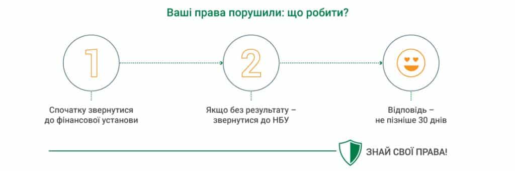 Якщо ваші права порушені і ви можете це довести, спочатку зверніться до фінансової компанії. Якщо вона не реагує на ваше звернення, ви можете звернутись до Управління захисту прав споживачів фінансових послуг НБУ.